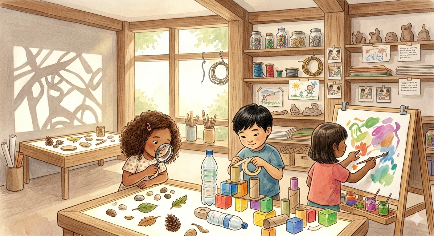 예를 들어, 아이가 종이배를 보고 "젖어서 찢어질 것 같아요"라고 할 때, "안 젖는 종이도 있어"라고 답을 주는 대신 "그러게! 그럼 어떤 재료면 안 젖을까? 직접 찾아볼까?"라고 질문을 되돌려주며 탐구를 시작하는 것이 레지오식 접근입니다.