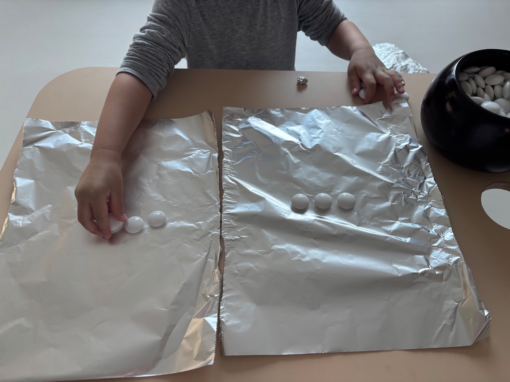 레지오 에밀리아에서는 교사가 아이에게 탐구할 거리를 던져주는 것을 '제안(Provocation)'이라고 합니다. 저는 오늘 아이에게 같은 크기의 호일 두 장과 바둑알 6개를 내밀었습니다.